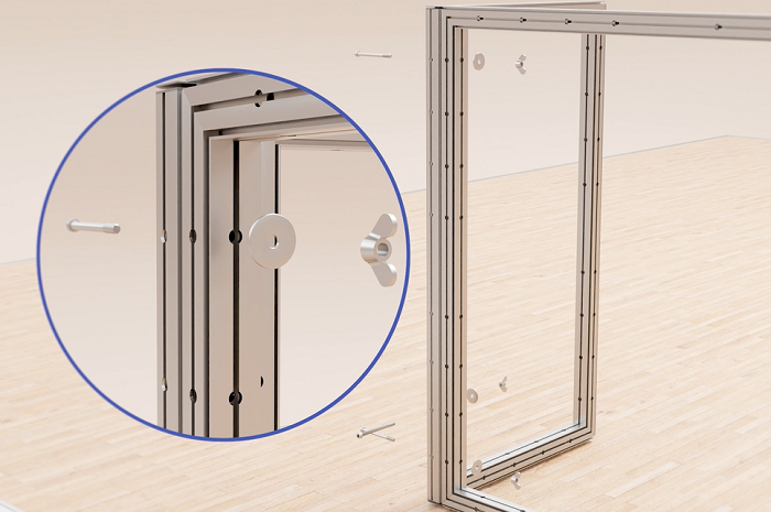 L'installazione è semplice ed intuitiva. I telai sono collegati tramite viti M6 permettendo di allestire velocemente e in autonomia diverse strutture modulari nello spazio espositivo con grafiche sostituibili su entrambi i lati (di tessuto tessile o pannelli come pvc o Sirobond).