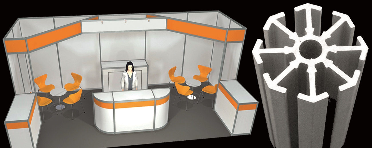 La gamma di forme e sezioni dei profilati in alluminio consente di realizzare stand fieristici, espositori portatili, negozi, e box per manifestazioni sportive.