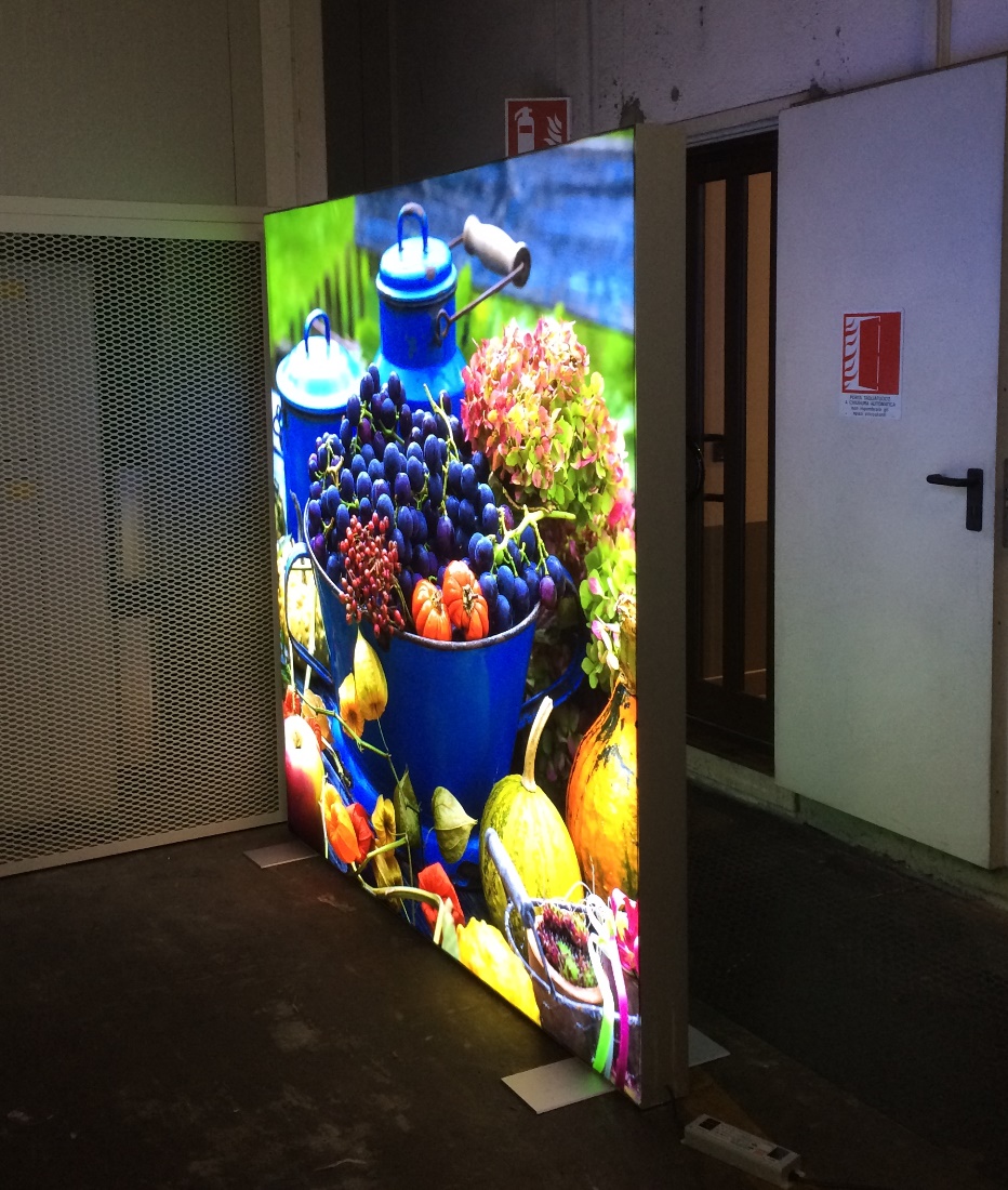 La struttura in alluminio abbinata alle luci a Led garantisce un risultato d'impatto in diverse occasioni. In fiera, in show room, o in vetrina i Totem Wall Luminosi sono ideali per tutti gli spazi espositivi.