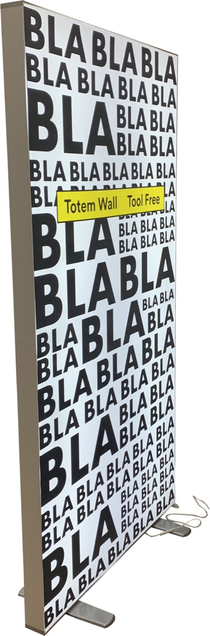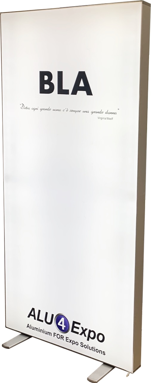 BLA è un Totem Bifacciale Luminoso Autoportante con impianto di illuminazione a Led perimetrale. Completo di 2 basi di appoggio rotanti per garantire la massima stabilità. E' realizzato con profili di alluminio da 80 mm che lo rendono autoportante. L'assemblaggio è facile e veloce senza necessità di utensili.